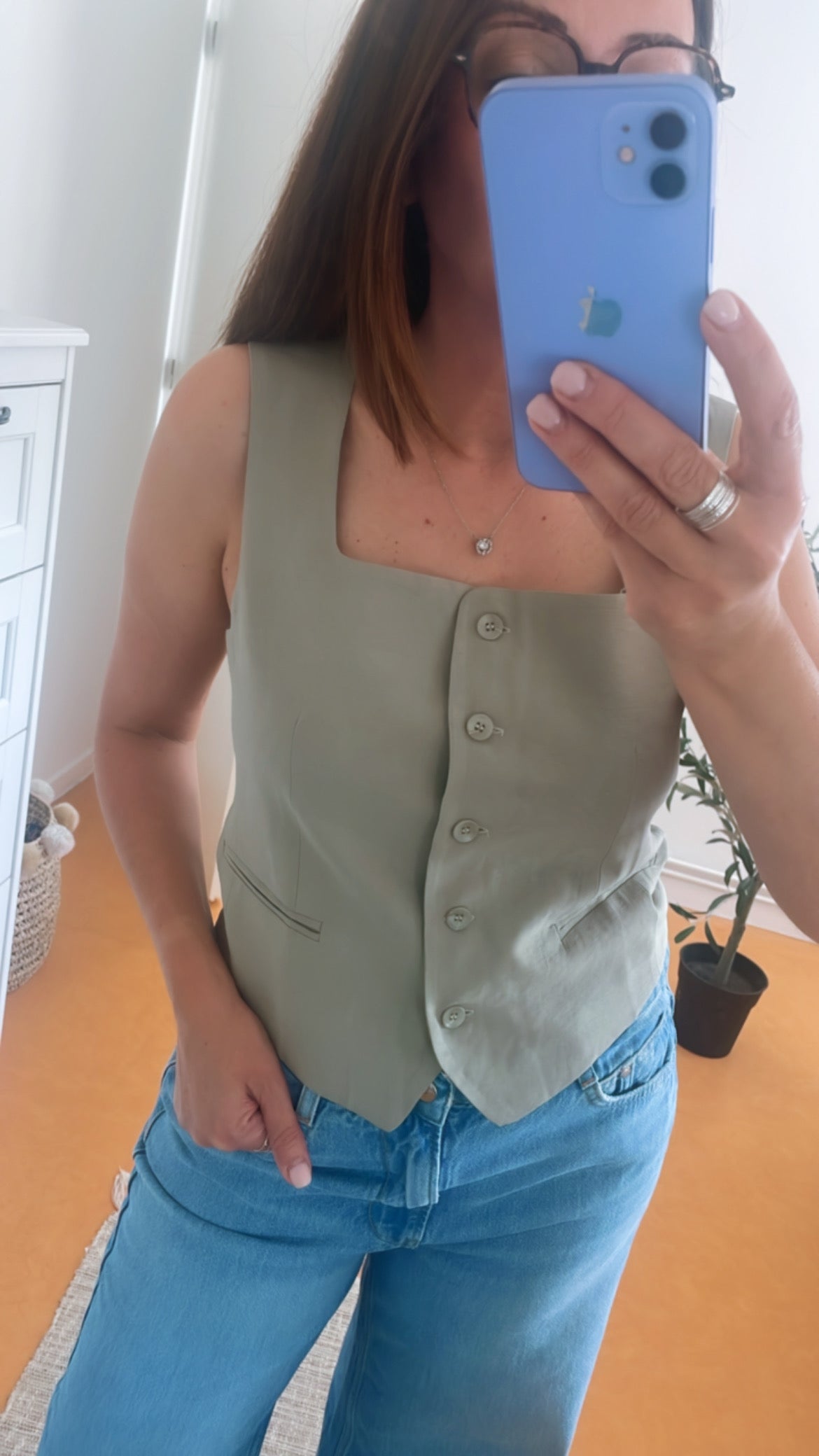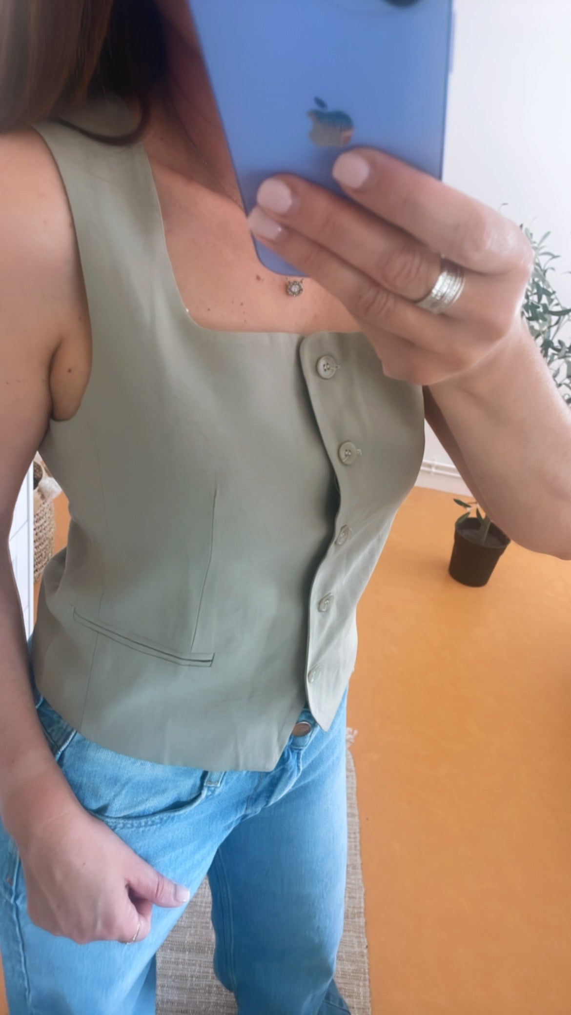 Débardeur Amelia manches épaules larges, boutonnés, vert amande, doublé 30% polyester,65% viscose et 30% lin pour mon 36 38 je porte un M